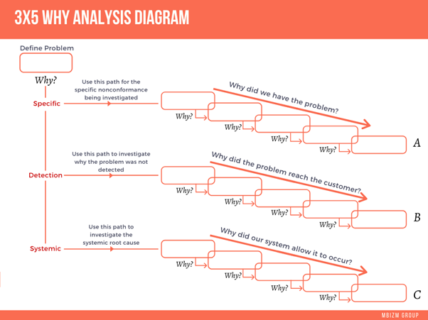 Should you require further analysis of the problem from the five why analysis tools, you may use the 3X5 Why Analysis as this tool is more specific. It can be done more precisely according to three different causes; specific, detention and systemic.