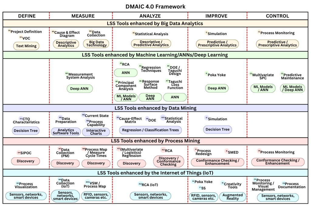 What’s more, [1] provides an extensive study that demonstrates the development of DMAIC 4.0, which entails the integration of Lean Six Sigma with Industry 4.0 technologies into the DMAIC phases. This enhanced Lean Six Sigma model is designed to address common limitations of the traditional LSS (i.e., manual data collection, challenges to sustain improvements, etc.) through the introduction of 42 enriched tasks supported by digital tools. Using action research in a German manufacturing company for validation of its effectiveness, and further confirmed by a Delphi study, the model demonstrated both theoretical and practical contributions. This made DMAIC 4.0 a robust methodology capable of driving operational excellence in the era of digital transformation.